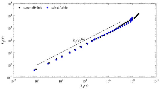 such that for fluid turbulence and for MHD turbulence . The ESS is a powerful technique for investigating scale invariance, widely used in many different systems [14,43,44], with several advantages with respect to the “usual” scaling against :