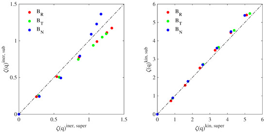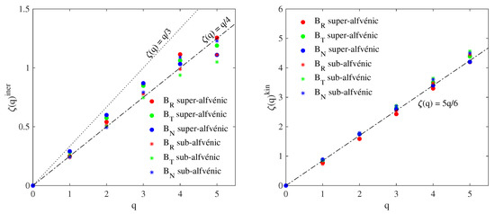 A rough look seems to highlight that there are no differences in the scaling properties of the super-alfvénic interval with respect to the sub-alfvénic one. This is true both for the inertial range (Figure 4, left panel) and for the kinetic regime (Figure 4, right panel). Indeed, scaling exponents across the inertial range show deviations from both the Kolmogorov and the Iroshnikov–Kraichnan linear predictions, being characterized by a nonlinear convex behavior with q, more pronounced for , for both solar wind intervals. This means that anomalous scaling features are observed, as expected for intermittent turbulence, supporting the multifractal nature of the inertial range both in the sub-alfvénic and in the super-alfvénic regions close to the Sun. Furthermore, different scaling exponents are obtained for the different magnetic field components as well as for the two intervals, thus indicating a possible source of anisotropy of scaling features reflecting the anisotropic nature of the field fluctuations [26]. At sub-ion/kinetic scales (Figure 4, right panel) a linear scaling is observed, with a Hurst exponent close to 5/6, quite similar for all magnetic field components and for both intervals. This observation suggests the absence of intermittency at kinetic scales, with a mono-fractal nature of field fluctuations, consistent with near-Earth [15,16] and near-Sun [17] solar wind. Thus, our results suggest that there are no differences in terms of scaling features and self-similar nature between the sub-alfvénic and the super-alfvénic near-Sun solar wind, although some differences emerge across the inertial range.