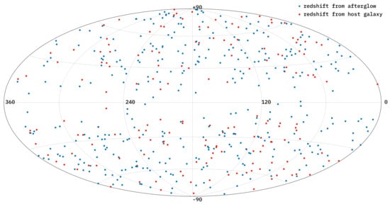The GRBOX catalog database (published by the Caltech Astronomy Department) has been carefully reviewed by its creators to avoid observations with large systematic uncertainties. The redshift data in Horvath et al. [7] contain spectroscopic redshifts only. Photometric redshifts, as well as redshift estimations based on Ly- limits are excluded as they introduce large (typically more than several hundreds of Mpc) radial distance uncertainties. By November 2013, the redshifts of 361 GRBs had been determined, and as of March 2018, the redshifts of 487 GRBs have been measured. Here, we expand the data of Horvath et al. [7] with new observations, till 4 June 2021. Greiner’s table and the relevant Gamma-ray Coordination Network messages were also used to enhance the data. This process resulted in a total of 522 GRBs with precise position and spectroscopic redshift. The redshift’s optical observation type according to afterglow or host galaxy detection is registered as well. The galactic distribution of these 522 GRBs is shown on Figure 1, according to the redshift origin (afterglow or host galaxy measurement).