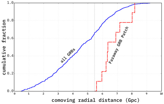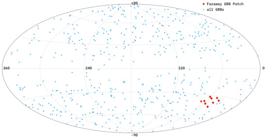 This method selects an interesting region with a spherical cap size of 12–14, with a corresponding random probability of ≈1%. This signal is from one region, the Faraway GRB Patch (Figure 6), where nine distant GRBs are concentrated (Figure 2). All redshifts are from afterglow observations for the Faraway GRB Patch.