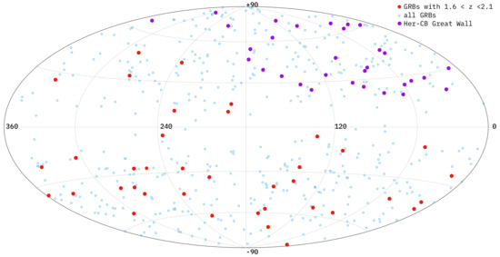 During the analysis, a large regular formation of GRBs was found: the Giant GRB Ring is displayed by nine GRBs, with an angular major/minor diameter of , at a comoving distance of ≈2.77 Gpc in the redshift range, with a probability of of being the result of a random fluctuation only [25]. The size is ≈1.7 Gpc, a bit smaller than the Hercules-Corona Borealis Great Wall, but larger than the large quasar group ( Mpc, [26]). In Figure 4, the Giant GRB Ring’s redshift range is shown using current GRB data.