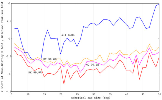 For the reconstruction of the full three-dimensional GRB distribution, the main question is whether the sky distribution is independent of the redshift (comoving radial distance) or not. We tested this correlation in the following way: around each GRB, the radial distance distribution of the neighboring GRBs within an -sized spherical cap were determined. The Mann-Whitney U-test’s Z score was determined between the full and the local dataset using the full radial distribution (i.e., Figure 2). As the full dataset contains the local data, as well, we performed Monte Carlo randomization and determined the Z score distribution for a total random local dataset. The whole process was repeated for the range for 1000 random datasets each. The result are shown in Figure 5: all the 99%, 99.5% and 99.9% values of the Monte Carlo simulations, as well as the smallest Z score from the real data (the second smallest values are above the 99% curve of the Monte Carlo simulations).