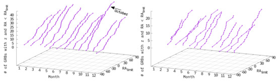 In Figure 7, we plot the N(>RA) cumulative number of GRBs as a function of the right ascension, for every month. All 522 GRBs from the current data were used. Here, we split the data according to the observations: redshift determined from afterglow means that prompt (or almost prompt) observations was performed—there are 354 such GRBs in our sample. Host galaxy observations could be done later; therefore, it is possible that the observational limits and strategies are different. We have 168 redshifts from host galaxy measurements. Campaigns and dedicated projects were (and hopefully will be) organized to measure the redshift of the known host galaxies: sometimes, this is done years after the GRB. The dichotomy between the afterglow and host galaxy determined redshift grouping is boosted further by the fact that host-based observations are rare above , i.e., their average redshift is lower.