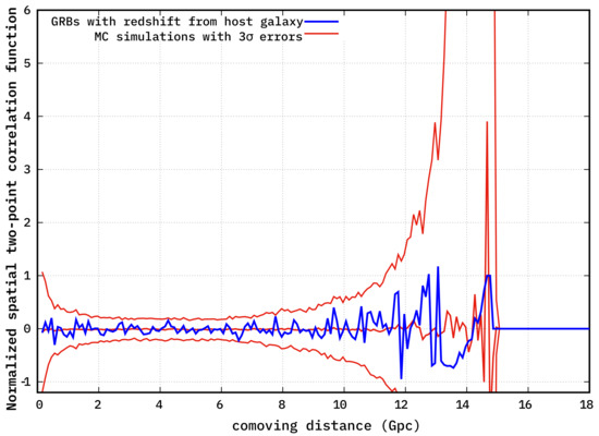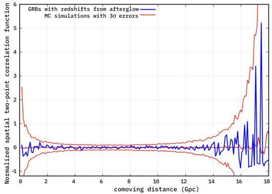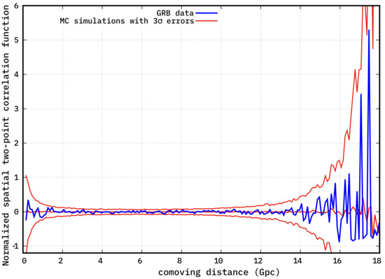 We should remark that Bagoly et al. [37] used the Spatial Two-Point Correlation Function to identify the interesting GRB 020819B and GRB 050803 pair. In their data, both GRBs had a spectroscopic redshift, and they caused a strong peak in Spatial Two-Point Correlation Function around 56 Mpc, with a probability of 0.00996 being a random fluctuation. Quite interestingly, both GRBs’ redshift values were questioned later in the literature, more than a decade later after the events. The Optically Unbiased GRB Host (TOUGH) survey [65] measured photometric redshift for the host galaxy of GRB 050803, unlike the previous preliminary value, and thus, we omitted this GRB from the dataset. Perley et al. [66] analyzed the purported spiral host galaxy of GRB 020819B at and used VLT MUSE and X-shooter observations to demonstrate that it is an unrelated foreground galaxy. They identified a possible radio afterglow with a star-forming galaxy at , which is consistent with the observations. Hence, as both previous estimated distances are probably wrong and the new values are differ significantly, the peak observed in Bagoly et al. [37] obviously should not appear in these results.