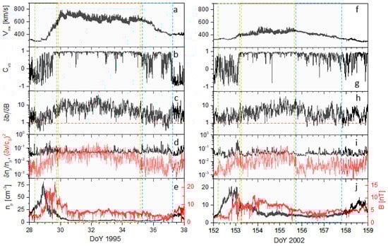 The data analysis is based on on-board plasma moments from the Three-Dimensional Plasma and Energetic Particle Investigation (3DP) and magnetic field data from the Magnetic Field Investigation (MFI) on board Wind both at a 3 s resolution, when the spacecraft was in the solar wind at 1 AU. Although magnetic field measurements are available at higher resolution (92 ms), a constrain is given by the resolution of plasma moments computed on board which is indeed 3 s. Although plasma parameters suffer from instrumental discretization at this time scale, this has no impact on lower frequencies’ power spectral density (as already discussed in []). We selected one representative (corotating) fast wind stream detected during the minimum of solar cycle 22 and three Alfvénic slow wind streams selected during the maximum of solar cycle 23 (see Table 1 for average bulk parameters). This is motivated by the fact that, although in previous studies e.g., [], the fast wind used for comparison was selected at a maximum of solar activity because it was found close to the Alfvénic slow wind, it is more appropriate to compare the Alfvénic slow wind to more standard corotating fast wind streams frequently observed during solar minimum e.g., [,], characterized by more stable solar sources.