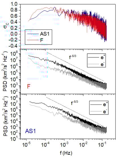 Refs. [,,] studied the scaling of the power spectra of the cross-helicity (), the residual energy () and the total energy () finding that while the slope of is close to −5/3, that of and are much closer to −3/2. In particular, [] found that the spectral index of is a function of , varying from roughly 5/3 when to approximately 3/2 when . Moreover, the same authors found that and spectra are usually well correlated in the inertial range. We performed a similar analysis on F, AS1, AS2, and AS3 (not shown here) basically confirming these scalings. As highlighted by [], the scaling of is related to the residual energy of the solar wind. Indeed, correspondence is found between magnetically dominated intervals, with , and steeper magnetic spectra. When , the magnetic energy dominates the kinetic energy; accordingly, the total energy is approximately equal to the magnetic energy (close to 5/3). When there is equipartition between kinetic and magnetic energy, the scalings of kinetic and magnetic energy spectra are similar and the scaling of the total energy is close to 3/2. The same authors suggested that the observed difference between the spectral indices of velocity and magnetic field turbulent fluctuations is due to the presence of negative residual energy caused by intermittent events (e.g., current sheets) in the magnetic field that are not accompanied by signature in the velocity fluctuations. Within this context, the different residual energy characterizing fast and Alfvénic slow streams would suggest a different content of intermittent structures. This aspect should be further investigated since intermittency has not yet been studied in Alfvénic slow streams.