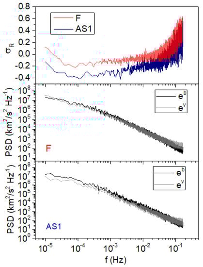 Figure 4 shows similar plots for (top panel), and in middle and bottom panels for for fast and AS1, respectively. Both cases show an imbalance in favor of the magnetic energy with values in the range −0.35 to −0.2 for AS1 and −0.2 to −0.1 for the fast wind in the frequency range between Hz and 0.04 Hz where values are more stable, avoiding the high-frequency part of the spectrum. Indeed, it must be noted that the tendency of to vanish and to an imbalance in favor of kinetic energy at higher frequencies is linked to a flattening of , related to instrument noise (for frequencies > 0.04 Hz), rather than a decrease of . These results basically suggest that the fast stream is closer to equipartition of energy.