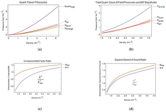 (a) Each quark flavor pressure and the total core pressure showing a weak dependence on quark mass values. (b) The total quark, gluon and magnetic fields pressures shown with the individual quark, gluon and MIT bag model pressures for a magnetic field at 3.2 × 1018 G and the bag model constant at 0.38 GeV/fm3. (c) Compressibility factors expressed as dimensionless ratios compared to the MIT bag model with a vacuum bag constant of 0.2 GeV/fm3 for no magnetic field and for the maximum field of 3.2 × 1018 G, (d) dimensionless squared speed compared to the MIT bag model for the case of no magnetic field and the same bag constant and for the case of the maximum magnetic field of 3.2 × 1018 G as a function of core density.