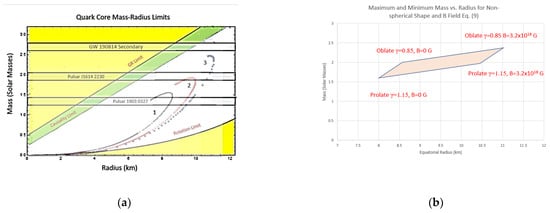 indicating that the gluons can play a considerable role in the total pressure of the compact core. The magnetic field resulting from the internal current densities also contributes to the pressure via a Lorentz force density which, by applying Maxwell’s equations, can be expressed as Fj = εjkl jk Bl = −∂iTji where Tji = −(1/2μo) [B2 δji − 2BjBi], resulting in pressure-like forces both parallel and perpendicular to the magnetic field direction, giving rise to anisotropic magnetic field interactions []. For the observed field strengths, these magnetic pressure terms can be similar in magnitude to the quark and gluon pressure terms at the Fermi temperature of the stellar core: pmag/pquark ~ 0.5. Fields of this strength alter the EOS and allow for a more massive core where crustal rigidity and rapid rotation [] can deform [] the stellar core into a prolate or oblate shape and can alter the long-term stability of the star []. For instance, Tatsumi found that when all the quarks stay in the lowest Landau level, there is a critical magnetic field where the EOS can support more mass in a static spherical geometry []. However, in general, the magnetic field alters the core shape to be oblate or prolate, which, for neutron stars, results in small changes in the equatorial radius and maximum mass. Such deformations have been observed in rapidly spinning neutron stars, magnetars and tidally deformed binaries []. Several shape parameters have been used for neutron star curst deformations and CFL quark stars [], including oblateness, which is the ratio of the polar radius to the equatorial radius, γ = Rp/Re, and eccentricity defined as e2 = 1 − γ2. For slow-rotating neutron stars, e~10−8, for fast-rotating neutron stars with high magnetic fields, e~0.01, and, with tidal distortions, e > 0.05. To cover slightly more than this range in oblate and prolate cases, we will examine cases where the oblateness ranges from 0.85 to 1.15. For neutron and quark stars, a static shape deformation can be explored with modified TOV equations by introducing a shape parameter into the metric []. The structure of the internal magnetic field is difficult to ascertain, in part due to phase change or superconducting boundaries, but some authors parametrize the field by phenomenological models that match a central field strength to the zero pressure surface. For instance, Chatterjee [] examined several models with improvements on the widely used Sigmoid-like contributions using linear and quadratic exponentials and fixed central core values that match surface values which can be expressed as functions which are not self-consistent solutions to the Einstein–Maxwell equations. Generally, they depend on the ratio of baryon number density to nuclear density, part of which has the form [,]: B(nB/no) = Bs + Bc [1 − exp(−β (nB/no)γ)] with two parameters β and γ, which they generalize to a multipole form. As noted by Kayanikhoo [], these models for neutron stars have surface magnetic fields in a range of about 1012–1014 G with corresponding internal fields from about 1018 to 1020 G. However, for an internal EOS with gravitational and magnetic sources of pressure, there exists an inflection point in the mass vs. radius curve, the Mallick [] critical point, where the magnetic pressure and the matter pressure are balanced. When the magnetic field is increased beyond this point, there is no longer a maximum to the mass even though the gravitational energy is greater than the magnetic energy, indicating the limit to the application of the EOS. Here, we find the maximum field strength is 3.2 × 1018 G, making this our cutoff maximum value.