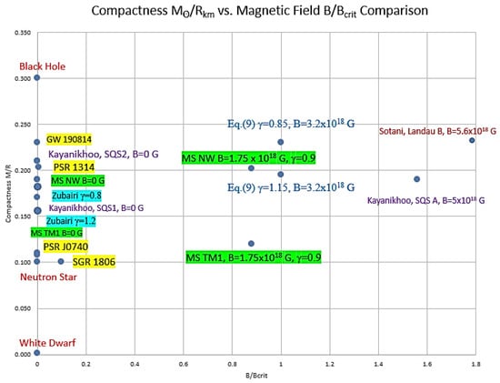 The numerical solutions to the modified TOV equations show that the magnetic field can produce a stiffer EOS up to the critical value, while the deformation increases the stiffness and mass for oblate shapes and decreases the stiffness and mass for prolate shapes. To compare our results to other models that include deformations or magnetic fields, we examine the compactness values for Mallick [,], Zubairi [], Kayanikhoo [], Sotani [] and our results from Equation (9). Compactness is defined as the ratio of total mass to equatorial radius; C = M/Req for the mass expressed in solar masses and the radius in km. The magnetic fields are scaled to the Equation (9) critical central field intensity Bc = 3.2 × 1018 G. These models cover a range of different approaches to EOS formulation, where some focus on magnetic field contributions, and Mallick and Sotani include shape deformations similar in scale to the ones used here. The two pulsars, PSR 1413 and PSR J0740, and the magnetar SGR 1806 hold the near-maximum observed mass and magnetic field values for measured surface fields. The GW 190814 event is near the maximum mass companion observed, but the event is model dependent. Figure 3 also includes the standard values for a white dwarf, neutron star and a Schwarzschild black hole.