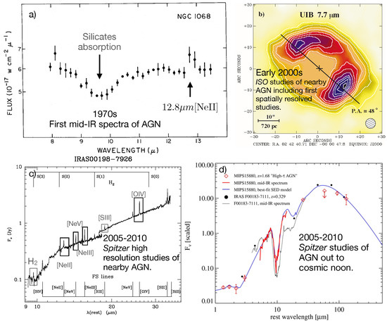 The history of the study of AGN in the infrared goes hand-in-hand with the history of infrared astronomy itself. Underlying it of course is the history of the development of infrared detectors—originally largely motivated by military applications (for a comprehensive review see Rogalski [37]). It is interesting to note, that the first observations of astronomical objects in the infrared were performed by W. Coblentz more than 100 years ago, in 1915 [37]. The development of increasingly sensitive detectors out to the mid-IR regime allowed for ground-based observations that revealed several basic characteristics of the mid-IR spectra of normal galaxies and AGN. The earliest observations obtained ground-based constraints at 2, 10 and 22 m of bright sources such as 3C273 and others [38,39]. These showed an upturn in the continua of galaxies toward the infrared that, in nearly all cases, could not be explained as simple extrapolation of the radio synchrotron emission. Rather, it was already interpreted as a distinct component, specifically thermal dust emission due to dust grains absorbing optical/UV light from the nuclear source [40]. Such thermal dust emission was limited to the infrared by the dust sublimation temperature of ≈1500 K [40]. A key early study was Rieke and Low [41] which showed ubiquitous mid-IR (10 m) emission both among regular spirals and Seyferts, as well as an early hint of the IR-radio correlation. Mid-IR variability on the scale of months was detected in several active galaxies including NGC1068 and 3C273 [42]. A 8–13 m spectrometer with at the Kitt Peak National Observatory 2 m telescope allowed for the first mid-IR spectra of just a handful of bright galaxies including the Seyfert NGC1068 and the starburst galaxy M82 [43,44]. These revealed several now familiar features such the 9.7 m silicate absorption, the [NeII] 12.8 m line, and a 11.3 m feature of then unknown origin, but later attributed to PAH. Overcoming the very challenging spectrometry (only available for a handful of galaxies), [45] used an ingenious technique of nested broad and narrow filters to detect and study the 9.7 m silicate absorption feature in a larger sample. Shorter wavelength low-resolution spectrometry also showed the 3.3 m PAH emission feature [46].