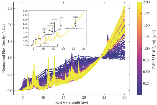 Stacked SEDs in bins of EW6.2 m where high EW galaxies are star-formation dominated, whereas low EW galaxies are AGN-dominated, at least in the mid-IR. The inset shows just two representative templates, one high EW6.2 m (this looks much like the stacked SED of local pure starburst galaxies [61]) and one low EW6.2 m (this appears very similar to the SED of an unobscured/Type 1 AGN (e.g., [18,51]), see also Figure 1c. Among IR galaxies, we see a continuum of equivalent widths corresponding to a continuum of AGN fractions. Besides the equivalent width, it is clear that star-forming galaxies have steeper 30 m/15 m slopes. Adapted from Lambrides et al. [69], with permission from the author.
