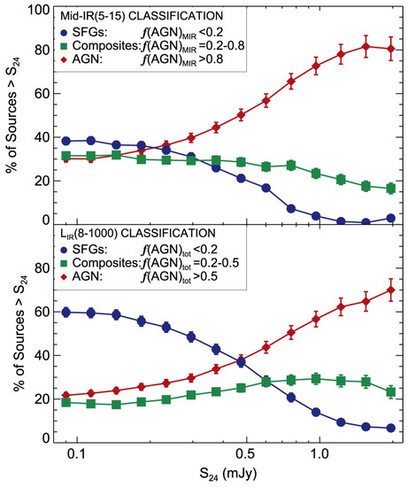 It is critical to note that in the mid-IR, we do not see a bimodal star-forming/AGN distribution but rather a continuum that gradually transitions from the star-formation dominated (strong-PAH) to the AGN-dominated (weak-PAH, predominantly power law continuum) spectrum. Typically, therefore, researchers in the field have modeled the mid-IR spectrum as a sum of a star-forming and AGN component with the relative amplitudes as free parameters and defined a mid-IR AGN fraction () on the basis of integrating (over, e.g., 5–15 m) the best-fit AGN-only component divided by the integral of the best-fit total model, (e.g., [8,9,10,53]). This approach has also led to our considering sources as SF-dominated if the SF component accounts for ≥80% of the total mid-IR emission or AGN-dominated, if the AGN component accounts for ≥20% of the total mid-IR emission (over the 5–15 m range) or a composite if the source lies in between. Figure 3 shows the relative distribution of SF-dominated, AGN-dominated and composite objects among the 24 m population. Note that while, unsurprisingly, AGN-dominated sources dominate among the mJy sources, composites remain an important component (20–25%) of the overall mid-IR source population even at the faintest fluxes.
