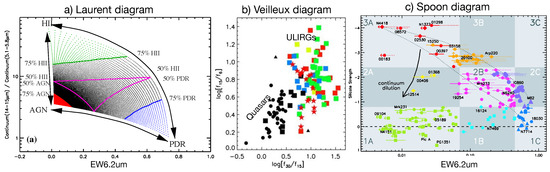 This shows three important mid-IR diagnostic diagrams where we see the continuous transition from star-formation dominated to AGN-dominated spectra. (a) The “Laurent diagram” [79], indicates a mixing diagram between AGN-like, HII region-like and PDR-like spectra involving the PAH equivalent width and the mid-IR 15-to-5 m continuum color. Adapted from Laurent et al. [79], © ESO. (b) The “Veilleux diagram” [74] shows the same 15 to 5 m continuum color on the y-axis, but now compares it with the 30 to 15 m color on the x-axis. All black symbols represent Seyfert 1 optical spectra, the blue squares are Seyfert 2 optical spectra. All other colors and the star symbols indicate sources with pure star-forming optical spectra. Adapted from Veilleux et al. [74], © AAS. (c) The “Spoon diagram” [80] has the same x-axis as the Laurent diagram but has the depth of the silicate feature along the y-axis, highlighting a potential embedded nucleus evolutionary phase. Adapted from Spoon et al. [80], © AAS. All figures reproduced with permission.