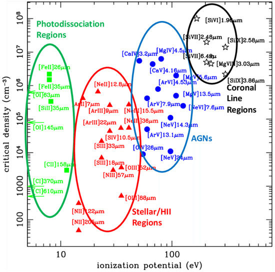 Above, we focus on the broad emission/absorption and continuum features such as seen in the lower resolution Spitzer IRS spectra—the only mid-IR spectra available beyond the local Universe so far. However, Figure 5, based on the original work of Spinoglio and Malkan [81], shows the wealth of mid-IR fine structure lines displayed in the ionization potential vs. critical density plane. The presence of any of the lines within the AGN or coronal line regions can be considered an indication of the presence of an AGN in the system. Ratios of AGN to HII-like lines (e.g., [NeV]/[NeII]) can be used as diagnostics of the relative strength in the mid-IR of the AGN to the star-formation. Note that the AGN-like spectrum in the insert in Figure 2 shows high ionization potential (also known as AGN) lines including [NeV] 14.3 m, and [OIV] 26 m. We also see the star-formation line [NeII] 12.8 m and the borderline [NeIII] 15.5 m. Indeed, the [NeIII]/[NeII] ratio itself can be used as a diagnostic of the degree of AGN activity in a galaxy. Indeed, there is a strong correlation between the NLR lines [NeV] and [NeIII] spanning several orders of magnitude in luminosity [82], which places constraints on allowed photoionization models and explains why these two ratios both work as AGN diagnostics. As mentioned already in Section 3.1, the [NeIII]/[NeII] ratio has been shown to correlate with the PAH equivalent width [68] supporting the latter’s use as an AGN diagnostic. Of course, besides serving as indications of the presence or strength of an AGN, these mid-IR fine structure lines can serve as probes of the physical conditions (e.g., metallicity, temperature, density) of the gas in the NLR, as well as more broadly in the AGN host galaxy [83]. For a recent review of emission line diagnostics including in the mid-IR see Kewley et al. [84]. We return to this point in more detail in Section 5.1. Lastly we note that here we focus on the mid-IR diagnostic lines only, but of course ALMA has been observing the far-IR emission lines, especially the PDR [CII] 158 m line, out to 6. As an example, we refer the reader to the paper of A. Faisst on the results of the ALPINE survey, presented in this Special Issue.