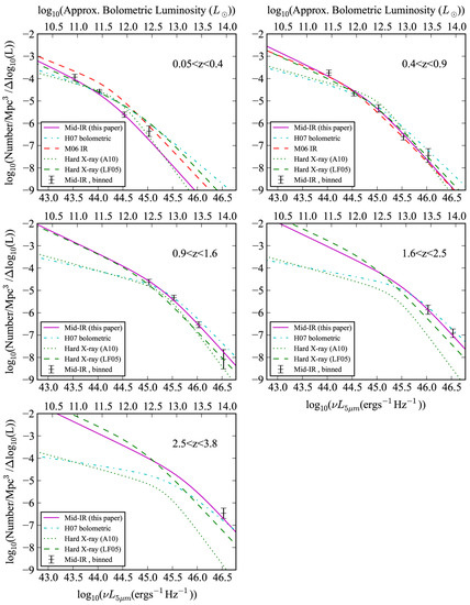 Luminosity functions of mid-IR selected (and spectroscopically confirmed) AGN compared with estimated bolometric luminosity functions (H07; [104]) and luminosity functions based hard X-ray selected AGN (LF05; [105]) and (A10; [106]). More recent results on the mid-IR AGN LF are consistent with these at the high-L end, but show somewhat less steep slopes in the low-L regime [19]. Adapted from Lacy et al. [101], © AAS. Reproduced with permission.