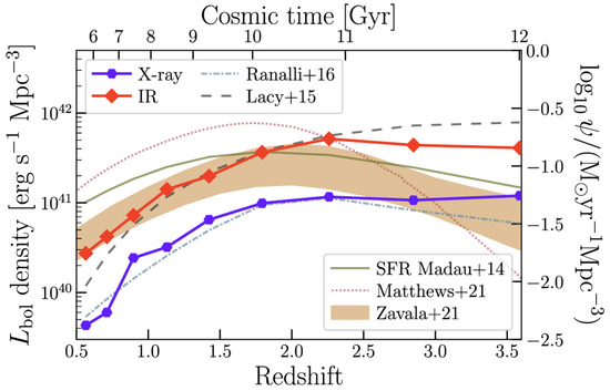 The AGN luminosity density (proxy for the black hole accretion rate density) as derived from the IR vs. X-ray AGN luminosity functions. Note that at all redshifts, the IR selected AGN dominate the luminosity density. Morever, the shape of this function (for the IR), is similar to the more recent determination of the SFRD [107] including the greater contribution of dusty galaxies at . Adapted from Runburg et al. [19]. Reproduced with permission by the author.