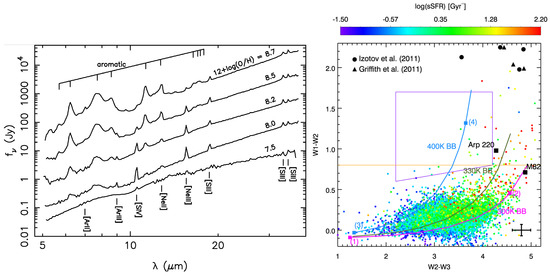 Here, we highlight some issues with mid-IR AGN selection in dwarf galaxies. Left: Average mid-IR spectra of starburst galaxies, without AGN, binned by metallicity as labeled, adapted from Engelbracht et al. [112]. Right: The WISE colors of dwarf galaxies color-coded by sSFR. The model tracks represent an elliptical template+a hot dust blackbody component of the indicated temperature. Note the bulk of the dwarf galaxies with red W1-W2 colors are consistent with intense starbursts. The few more robust candidates for AGN powered systems all lie within the purple polygon which represents the Jarrett et al. [116] AGN selection, adapted from Hainline et al. [115], AAS©. Reproduced with permission.