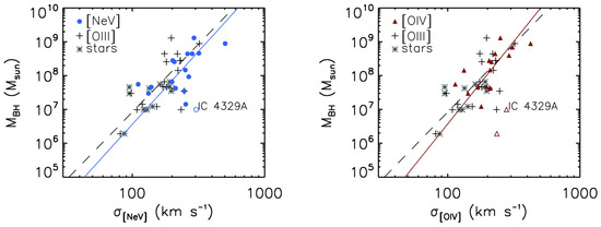 The relationships between reverberation mapping determined black hole masses and mid-IR line velocity dispersions where we have [NeV] 14.3 m on the left and [OIV] 26 m on the right. Adapted from Dasyra et al. [55], AAS©. Reproduced with permission.