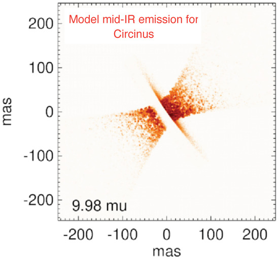 A model for the mid-IR emission of the Circinus galaxy constrained by both mid-IR pc-scale interferometric observations with VLTI/MIDI as well as the global SED. This is the best-fit model which is a thin disk, consisting of a mixture of graphites and silicates (accounting for the absorption seen in this ∼10 m model), plus a hollow hyperboloid, consisting of predominantly graphites. This model is consistent with the very recent VLTI/MATISSE high-resolution imaging of Circinus presented in Isbell et al. [138]. Reproduced from Stalevski et al. [137] with permission from the author.