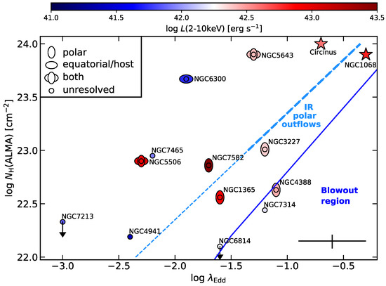 An illustration on the dependence of mid-IR continuum morphology (as presented in the symbols) on the Eddington ratio and column density for a sample of local Seyferts. To the right of the solid line is the region where the AGN wind is able to blowout all surrounding material. To the right of the dashed line is where IR polar outflows are expected to develop, consistent with the observations. Both Circinus and NGC1068 also show polar dust emission, although not part of this particular study which is why they are given different symbols. Reproduced with permission from Alonso-Herrero et al. [141], ESO©.
