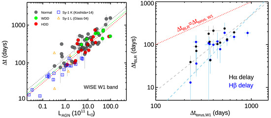 Left: The optical-to-mid-IR time-lag () scales with the AGN luminosity as . Here, the filled symbols correspond to WISE 3.4 m light curves for quasars, whereas the open symbols correspond to literature measurements in the K-band for Seyferts. The measured lag implies a size of the 3–4 m dust emitting region to be pc for an L quasar. Right: Comparison with the time lags to the BLR suggests that this mid-IR emitting dust is roughly 4× further away than the radius of the BLR. Reproduced with permission from Lyu et al. [29], AAS©.