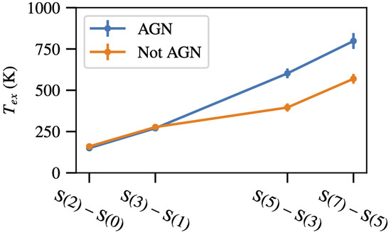 The excitation temperature for mid-IR AGN vs. non-AGN calculated from each pair of mid-IR ro-vibrational transitions, as labeled. This result highlights that the presence of an AGN directly affects the ISM of its host galaxy. Adapted from Lambrides et al. [69] with permission from the author.