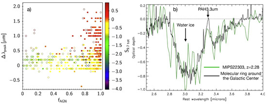 (a) The shift (relative to the canonical 9.7 m) in the peak of the mid-IR silicate feature, see, e.g., Figure 1d, is only seen in objects with high mid-IR AGN fractions, here , and silicates in emission, here red points. Adapted from Hatziminaoglou et al. [168], with permission from the author. (b) Sources with deep silicate absorption also show other mid-IR absorption features such as the 3.0 m water ice absorption with the 3.3 m PAH feature often seen within that. Here, we show this behavior through the Spitzer-IRS spectrum of a cosmic noon deep silicate absorption AGN compared with the ISO-SWS spectrum of part of the molecular ring around the Milky Way Galactic Center. Adapted with permission from Sajina et al. [170], © AAS.