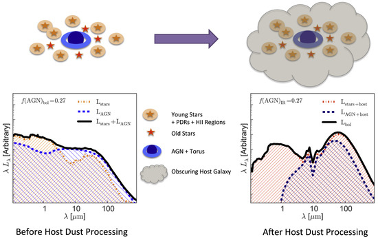 - Roebuck, E.; Sajina, A.; Hayward, C.C.; Pope, A.; Kirkpatrick, A.; Hernquist, L.; Yan, L. The Role of Star Formation and AGN in Dust Heating of z = 0.3–2.8 Galaxies-II. Informing IR AGN Fraction Estimates through Simulations. Astrophys. J. 2016, 833, 60. [Google Scholar] [CrossRef]