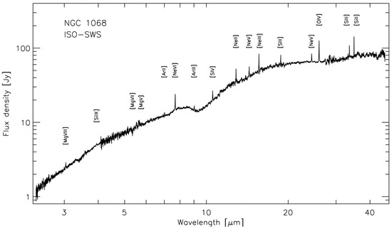 - Lutz, D.; Sturm, E.; Genzel, R.; Moorwood, A.F.M.; Alexander, T.; Netzer, H.; Sternberg, A. ISO-SWS Spectroscopy of NGC 1068. Astrophys. J. 2000, 536, 697–709. [Google Scholar] [CrossRef][Green Version]