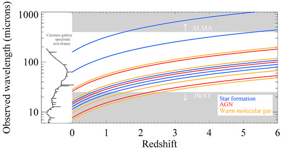 This review focuses in particular on the mid-IR regime, roughly 3–30 microns in the rest-frame. Thanks to a rich array of diagnostic broad spectral features and emission lines, this decade in wavelength is ideally suited for the study of star formation in dusty galaxies and AGN, and also for probing key ISM characteristics that may influence or be influenced by the presence of an AGN. The study of AGN in the mid-IR dates back to the 1960s but took large leaps forward thanks to the Infrared Space Observatory (ISO) [31]; the Spitzer Space Telescope [32] 1; the Wide-field Infrared Survey Explorer (WISE) Wright et al. [33]; and ground-based instruments such as MIDI [34] and MATISSE [35]. This study is now on the cusp of another huge leap forward with the advent of the James Webb Space Telescope (JWST) with its MIRI instrument, Rieke et al. [36]. For a more complete discussion of AGN properties in the infrared, we also refer the reader to two other reviews in this Special Issue. These are: “Infrared Spectral Energy Distribution and Variability of Active Galactic Nuclei: Clues to the Structure of Circumnuclear Material” by Jianwei Lyu and George Rieke; and “The Role of AGN in Infrared Galaxies from a Multiwavelength Perspective” by Vivian U.