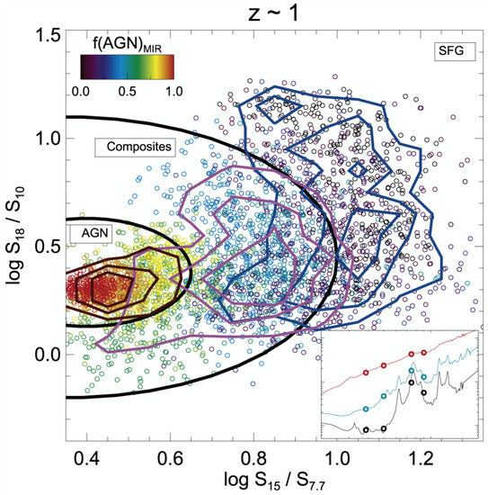 The relative contribution of SF-dominated, AGN-dominated and composite sources as a function of 24 m flux. These classifications are based on low resolution Spitzer-IRS spectra which are fitted with a model including PAH emission and continuum emission, the relative strength of which provides the fraction of AGN contribution to the mid-IR (). Adapted from Kirkpatrick et al. [10], © AAS. Reproduced with permission.