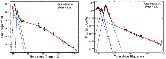were applied to fit the the flares and underlying continuums [15,33,36,43], where , and are the temporal slopes, is the break time, and represents the sharpness of the peak. The selection of does not significantly affect the value of [43]. is usually fixed to 3 or 1 in the flare fitting. However, in some flares, can significantly affect the goodness of fitting, because the peaks of some flares are not sharp but rather smooth. Occasionally, the steep decay, the shallow decay and the jet break might appear in the LC, which can be jointly fitted by the above empirical formulas. The two examples of the best-fitting LCs are shown in Figure 1.