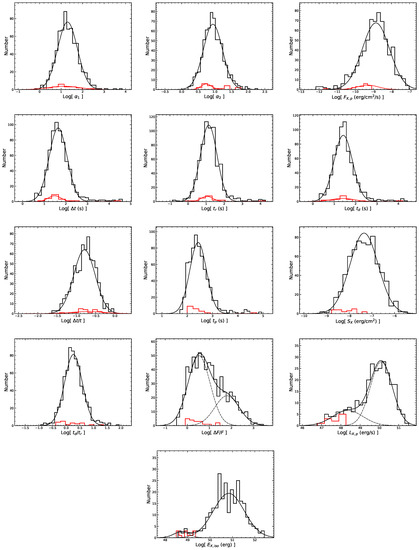 The distributions of the parameters for the X-ray flares. The black (red) solid lines represent the best fitting results for the LGRB (SGRB) flares with single or double Gaussian functions.