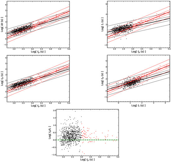 The correlations among the temporal parameters of flares. The black (red) dots represent the early (late) flares. The black (red) solid lines represent the best fits for the early (late) flares. The dashed lines represent the 1 and 3 confidence regions. The green dashed line in the last graph represents the axis of = 1. The regression results with a correlation coefficient less than 0.3 are not shown on the figure.