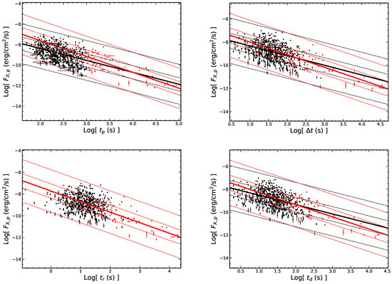 The correlations between LGRB and SGRB flares about the temporal parameters are similar. The black (red) dot represents LGRB (SGRB) flares. The dashed lines represent the 1 and 3 confidence regions. The regression results with a correlation coefficient less than 0.3 are not shown on the figure.