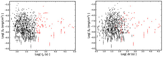 Previous studies have also found some correlations of the X-ray flares with continuously updated samples. Ref. [26] found that the width and the energy of the early flares (with a temporal boundary s) follow a power-law correlation and the 0.3–10 keV peak luminosity of the early flares decays with the peak time, i.e., and , respectively. Ref. [36] fitted a hybrid sample of X-ray flares and re-found that the peak luminosity correlated with the peak time: . In addition, the power-law distributions of the energies, durations, peak fluxes, and waiting times of the X-ray flares are similar to those of solar flares, indicating that the physical origins of these two phenomena are similar, which can be explained by a fractal-diffusive, self-organized, criticality model [20,36]. Ref. [23] studied the possible SGRB X-ray flares in a small sample for the first time. They claimed that the SGRB flares show similar mechanisms to the long ones, despite the distributions of the SGRB flares being located at lower energies. However, due to the limited size of SGRB flares (only 8 SGRBs), the quantitative conclusion may require further investigation. In this work, we further analyze the characteristics and physical nature of the flares based on a large sample.