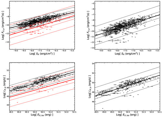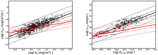 Here, the flare fluence () is calculated by integrating the corresponding SBPL function of the flare from the start time to the end time in the energy band of Swift/XRT [12,33,36]. Additionally, is the luminosity distance of GRBs [47,48]: