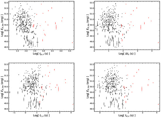 Similarly, we analyze the rest frame correlations for the LGRB flares and SGRB flares. As shown in Figure 13, For the LGRB flares, (r = and ). For the SGRB flares, (r = and ). The - correlation in our SGRB flares quantitatively confirms the conclusion of [23] that there is a factor of approximately 0.01 smaller than the long ones. is also correlated with the other temporal quantities (, and ) for the LGRB flares and SGRB flares. In addition, we do not find the significant dependence of the X-ray flare total energy () with the temporal quantities in the rest frame for either the LGRB flares or SGRB flares as shown in Figure 14. We also analyze the relationship between the peak luminosity and the total energy for the LGRB flares and SGRB flares and find that these two quantities are correlated, and the correlation of the SGRB flares may not be as tight as that of the long ones (see the right panel of Figure 11). For the LGRB flares, with r = 0.81 and . For the SGRB flares, with r = 0.19 and p = 0.5532.