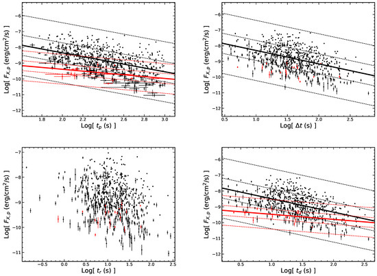 The correlations between the peak flux of flares and the temporal quantities in the observer frame. All symbols and descriptions are the same as in Figure 3.