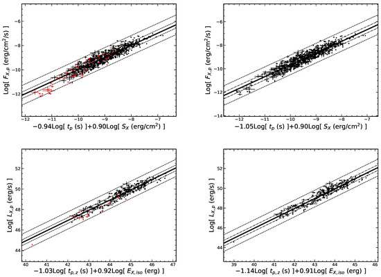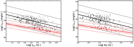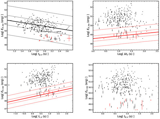 We also analyze the above three-parameters for the LGRB flares and SGRB flares and obtain (r = 0.93 and and (r = 0.95 and ) for LGRB flares, while (r = 0.80 and ) and (r = 0.86 and p = 0.0008) for SGRB flares. The results are presented in the Figure 16 and Table 6. It can be seen from the fitting results that the slope index of varies significantly, while the slope index of the peak time is consistent within the error range.