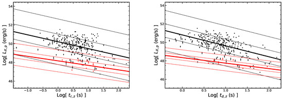 The peak luminosity of a flare can be derived from the formula . Cautiously, the k-correction is not considered in this paper like [33]. All the observed temporal parameters can be transferred to the rest frame by .