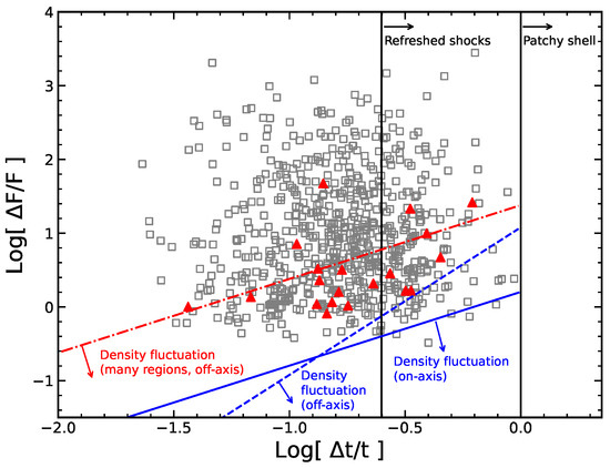 The relative variability of flux and relative temporal variability plotted on the constraint plane of the kinematic parameters [32]. Besides, the LGRB flares (grey squares) and the SGRB flares (red triangles) are demonstrated, respectively. The black solid lines shown are the case of patchy shells () and refreshed shocks (). Off-axis density fluctuation of single variable regions () and of many variable regions () are demonstrated by blue dash line and red dot dash line, respectively. The case of on-axis density fluctuations () is plotted by blue solid line. The fraction of cooling energy ∼ and ∼ 1 are adopted here. More detailed description can refer to Ref. [32].