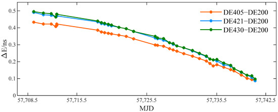 Comparison of Einstein delay during data observation. To clearly reflect the small difference in Einstein delays during observation, subtract DE200 Einstein delay from DE405, 421 and 430 Einstein delays, respectively. The orange curve “DE405–DE200” in the figure represents ; the blue curve represents ; the green curve represents .
