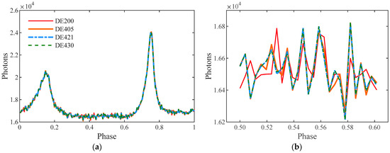 Based on the above analysis, it was found that the ephemeris is an important variable to be considered in time scale conversion and spatial light-travel delay calculation, and its influence does not need to be considered too much in phase calculation and phase comparison. In the actual timing applications, if the actual period of pulsars is not searched according to the photon sequence, but the timing parameters published by some institutions (including period, phase and its derivatives), it is necessary to pay attention to the ephemeris used in the data. For example, the Crab timing parameters published by the British Jodrell Bank Observatory use DE200, and the ephemeris used for similar data of the Australian Telescope National Facility (ATNF) is DE405 [32,33]. The mixing of several ephemerides in the timing process may produce a certain systematic deviation.