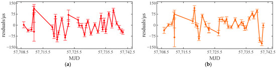 In the pulsar timing calculation, a relatively strict calculation process was adopted, and the results were improved compared with some research results using the same data [7,17]. The timing residuals error of multiple groups of data is less than 50 microseconds, and the corresponding ranging error is less than 15 km. If the corresponding timing accuracy is converted into positioning accuracy, it has satisfied the navigation and positioning requirements of the transfer orbit segment of the deep space explorer. At the same time, how to form an effective timing measurement in a short time is the focus of future research.