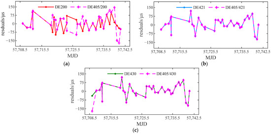 It was found that the timing residuals of each group calculated based on the four ephemerides are less than 150 microseconds, and the RMSE and MAE values are also very close; the difference is less than 2 μs. Similarly, the timing residuals obtained by DE200 are quite different from those obtained by the other three ephemerides (mainly expressed in the timing residuals at a single point); the difference between the timing residuals of each group of the results obtained from DE405, DE421 and DE430 is very small, and their MAE values of is slightly better than that of DE200, indicating that their internal accuracy is higher. The systematic trend of timing residuals due to different ephemerides is the same as that of time conversion and light-travel delay calculation.