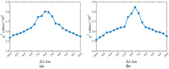 For each ephemeris, take the GPS coordinate values recorded by the satellite in the J-2000 coordinate system as the nominal orbit, add errors on the coordinate values in 1 km steps to obtain , and the range is km. Calculate the value under each coordinate and determine the range of the optimal orbit according to the size of the value. The values obtained from different ephemerides are shown in Figure 7 and Table 6 shows the specific values.