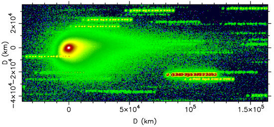 The heliocentric ecliptic coordinates of the particle are then conveniently transformed into the coordinate system (see [59]). In this system, the axis points to the same direction and sense as the Sun-to-comet radius vector, is contained in the comet orbital plane and is directed opposite to its orbital motion, and is perpendicular to the orbital plane and chosen to form a right-handed set with and axes. The final step is the transformation to the plane-of-sky coordinates, the so-called system, where M is the prolonged radius vector from the Sun and N is perpendicular to M and directed opposite to the object’s motion along its orbit. To perform that transformation, the coordinates of the Earth in the frame at the time of observation must also be computed, for which we need the heliocentric ecliptic coordinates of the Earth. Those coordinates can be obtained from, e.g., the JPL Horizons online Ephemeris System. The transformation of the to the frame is described in [59].