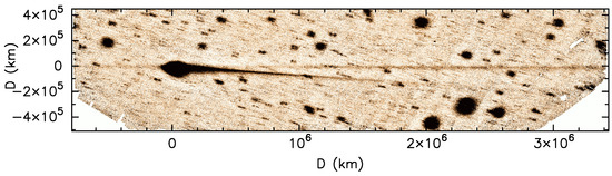 Trail and neck-line image of comet 67P obtained on 8 March 2016, at a heliocentric distance of 2.53 au, using the Hyper Suprime-Cam (HSC) on the 8.2-m Subaru telescope at Mauna Kea. The image is oriented so that the trail appears horizontally. Distances (D) are projected distances at the nucleus position in the sky. Adapted from [57].